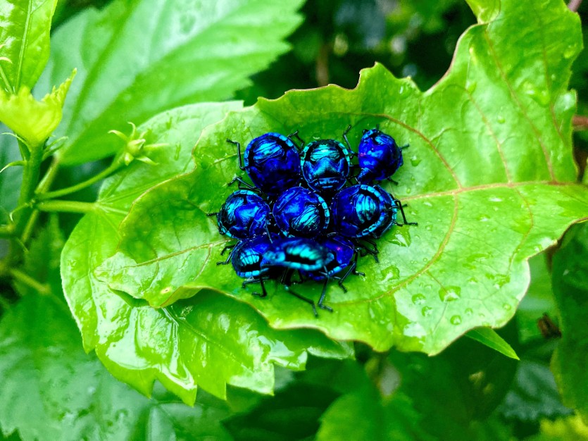 La nature est aussi belle que surprenante. A l'image de ces insectes bleus regroupés sur cette feuille d'hibiscus dans un jardin de Nouméa. D'ailleurs, si nos lecteurs connaissent le nom de cette espèce et connaissent les raisons d'un tel regroupement, il est possible de nous écrire à l'adresse suivante : redaction@lnc.nc