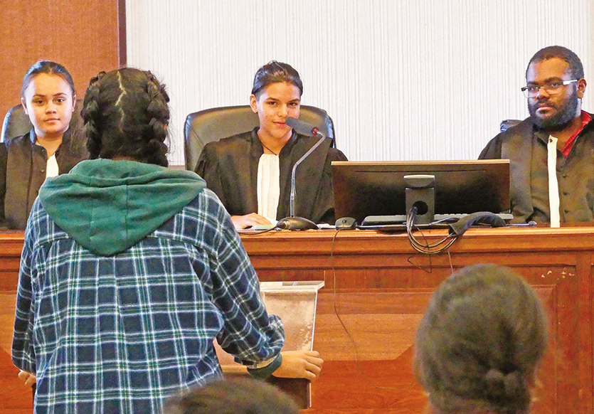 Vous trouvez sans doute ces magistrats un peu jeunes ? Normal, il s’agit de lycéens (Grand Nouméa à Dumbéa et Anova à Païta) qui ont revêtu la robe le temps d’un après-midi pour rejouer un procès pénal en situation réelle. Objectif ? Mieux comprendre les rouages de la justice pour ces étudiants qui se destinent à des cursus juridiques. Et qui constitueront peut-être, qui sait, la relève parmi les magistrats, avocats et greffiers. Photo P. Ch.