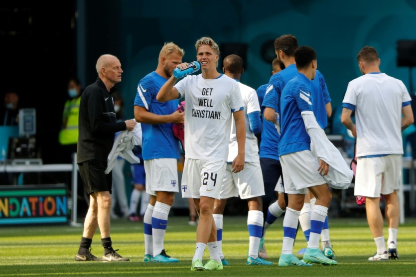 Le milieu de terrain Onni Valakari arbore un T-shirt en hommage au Danois Christian Eriksen, toujours hospitalisé après son malaise cardiaque en plein match contre la Finlande, avant le match contre la Russie, le 16 juin à Saint-Petersbourg