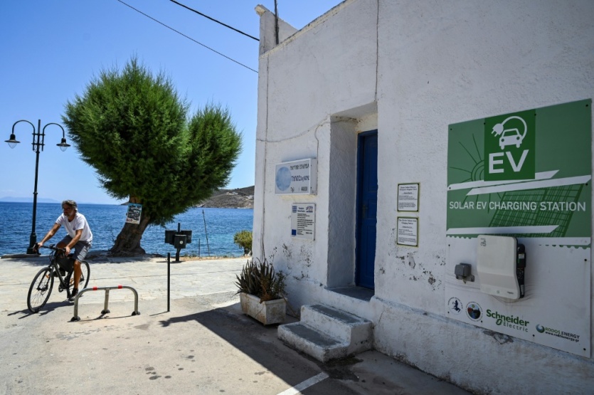 Un cycliste passe devant une station de recharge solaire pour véhicules électriques, sur l'île de Tilos, en Grèce, le 22 juin 2021 ARIS MESSINIS [AFP]