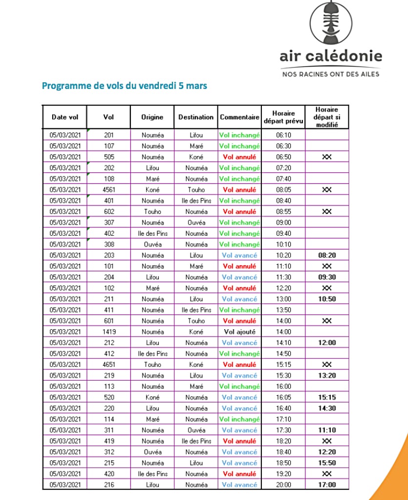 [MAJ 16:50] Air Calédonie vient d’annoncer l’annulation de ses vols le samedi 6 mars. La compagnie aérienne précise : " L’ensemble des vols de la journée du samedi 6 mars sont annulés. Afin de pouvoir assurer le transport des passagers prévus, le programme de vols de vendredi est adapté avec quelques modifications horaires à prévoir. Les passagers qui avaient des réservations entre vendredi et dimanche sont invités depuis ce jeudi matin, s’ils le peuvent, à modifier leur voyage. À ce titre, des dérogations commerciales exceptionnelles sont accordées afin de permettre la modification de ces réservations, jusqu’au 31 mai 2021, sans pénalité, quelles que soient les conditions tarifaires choisies."