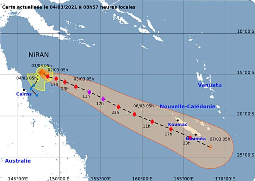 - Brice Bacquet | Crée le 04.03.2021 à 11h30 | Mis à jour le 04.03.2021 à 18h56ImprimerLa trajectoire du cyclone Niran se précise. Carte Météo-France NCL’évolution de Niran se précise. La dépression tropicale est passée au stade de cyclone.