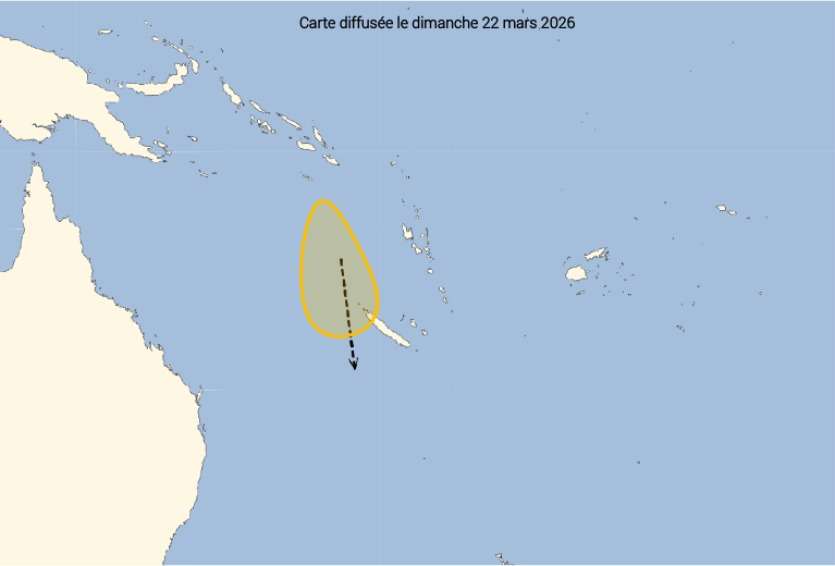 "Cette dépression circule vers le sud et passe entre lundi et mardi à l’ouest de la Nouvelle-Calédonie engendrant un épisode de fortes pluies, très probablement sur le Nord et de manière un peu plus incertaine plus au Sud", indique Météo France. Elle devrait suivre une trajectoire qui la fera passer à environ 100 à 150 km à l’ouest de la pointe Nord de la Grande Terre puis au large de la côte Ouest, avant de s’éloigner mardi par le sud-ouest.