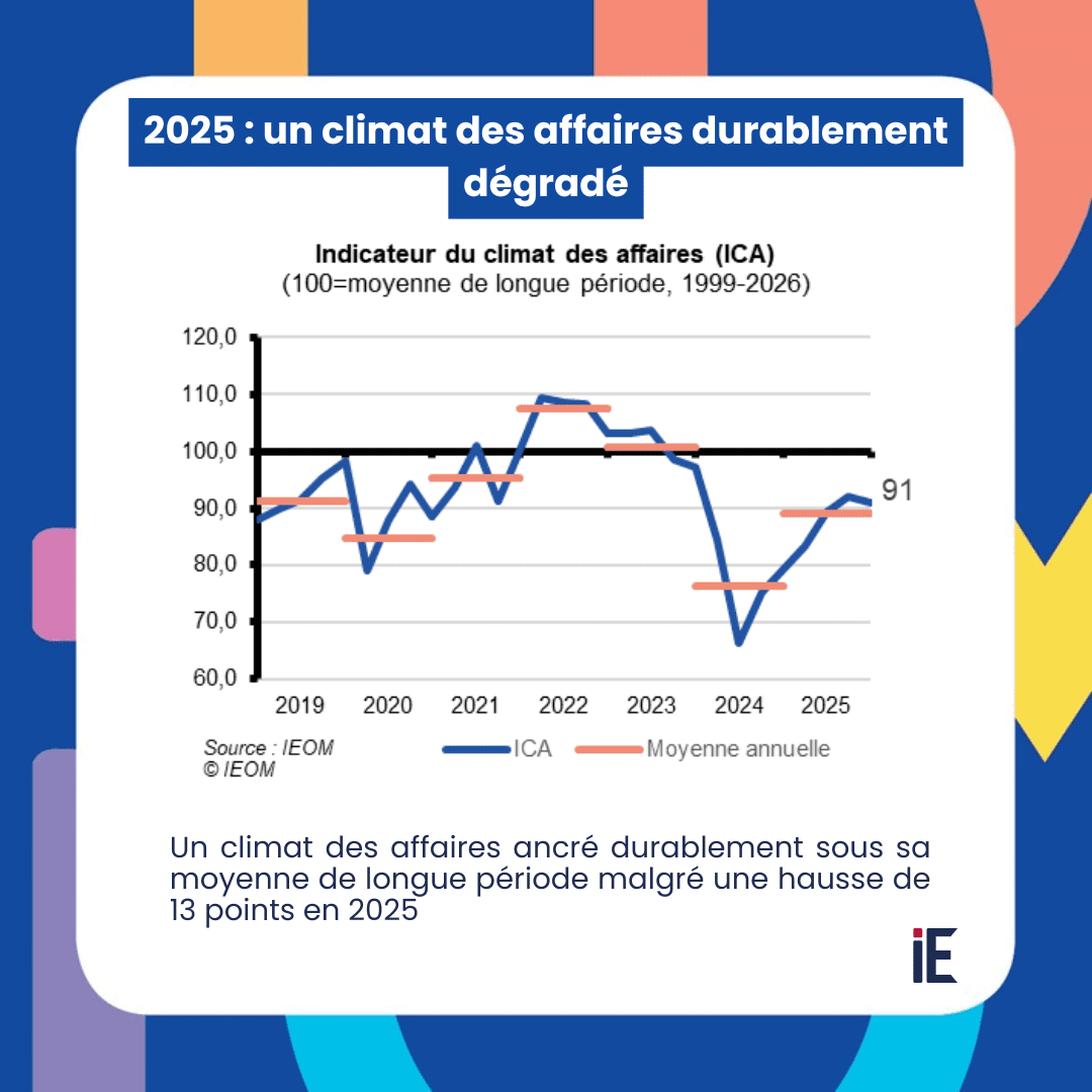 Le climat des affaires, qui reflète le moral des entreprises, se redresse progressivement après avoir touché le fond en 2024. En fin d’année 2025, il s’est stabilisé, sans toutefois retrouver son niveau d’avant-crise. Autrement dit, les chefs d’entreprise sont un peu moins pessimistes, mais ils restent prudents. Près d’un tiers d’entre eux craignaient encore une défaillance à court terme fin 2025.