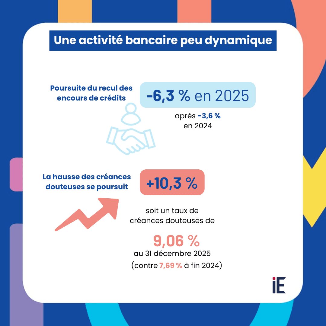 Un contexte qui n’a pas incité les entreprises à investir. Les crédits bancaires ont continué de diminuer (-6,3 % sur un an), signe d’une activité au ralenti. Et les difficultés de remboursement ont augmenté. Le taux de créances douteuses, c’est-à-dire les prêts que les banques peinent à se faire rembourser, a atteint 9,06 % fin 2025 contre 7,69 % un an plus tôt.